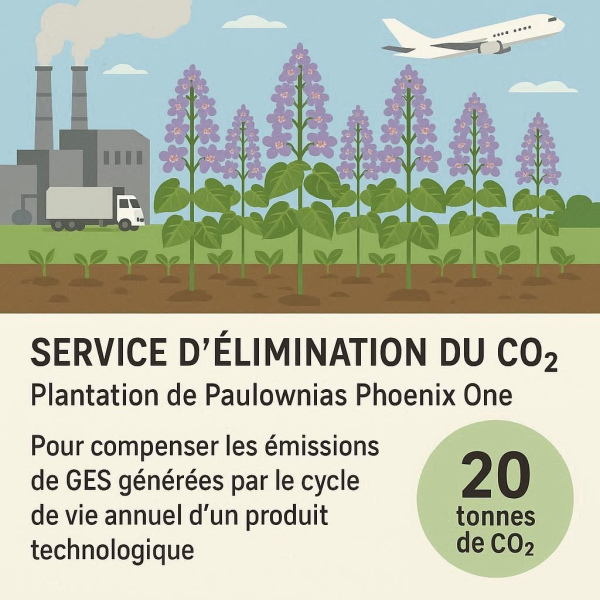 Ce service vous garantit que vingt (20) Tonnes de CO2 seront éliminées de l'air grâce à notre puits de carbone, soit l'équivalent des émissions du cycle de vie d'un produit technologique moyen pendant un an.