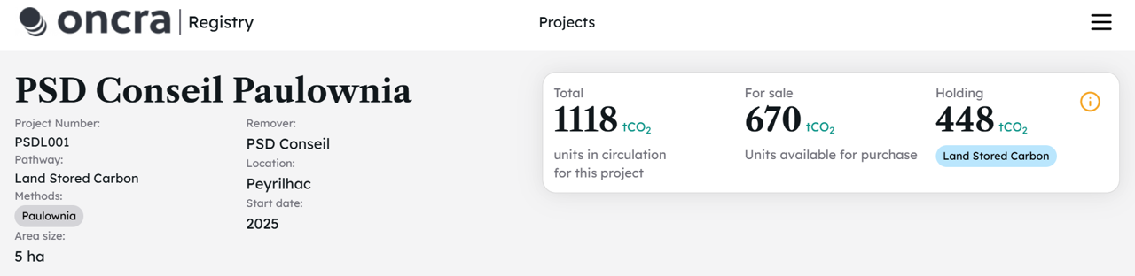 * A partir de la certification et de l’objectif de stockage de CO2 à 20 ans, une quantité de crédits carbone a été émise par ONCRA, pour une durée plus réduite (12 ans), en retirant une quantité d’émissions pour mener le projet à bien (20% par défaut) et en gardant des réserves le temps de vérifier l’atteinte des objectifs de stockage (20%) et de biodiversité (20%).