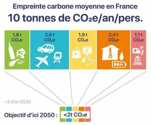 Source : ADEME. Un Français émet en moyenne 9,8 tonnes de CO₂ par an.